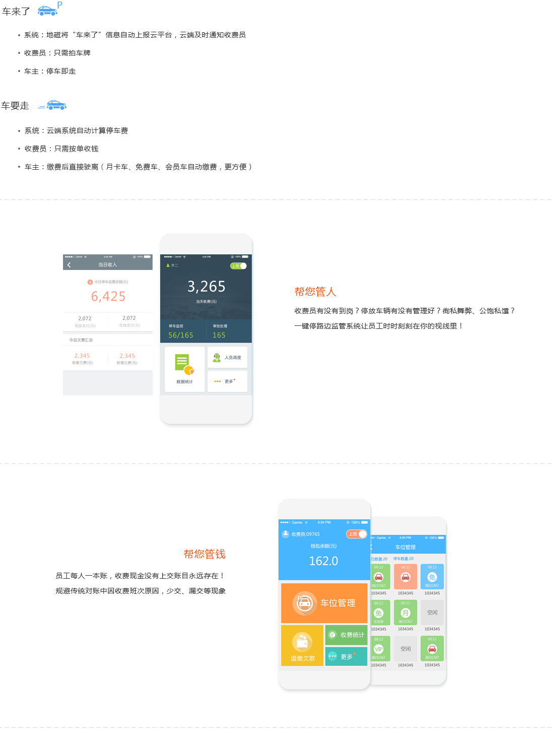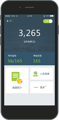 自主研发AP,可在智能手机上运行。满足监管人员对车位实时监控,对异常车辆及时 审批,对员工排班调度,对数据随时查看等多样化需求